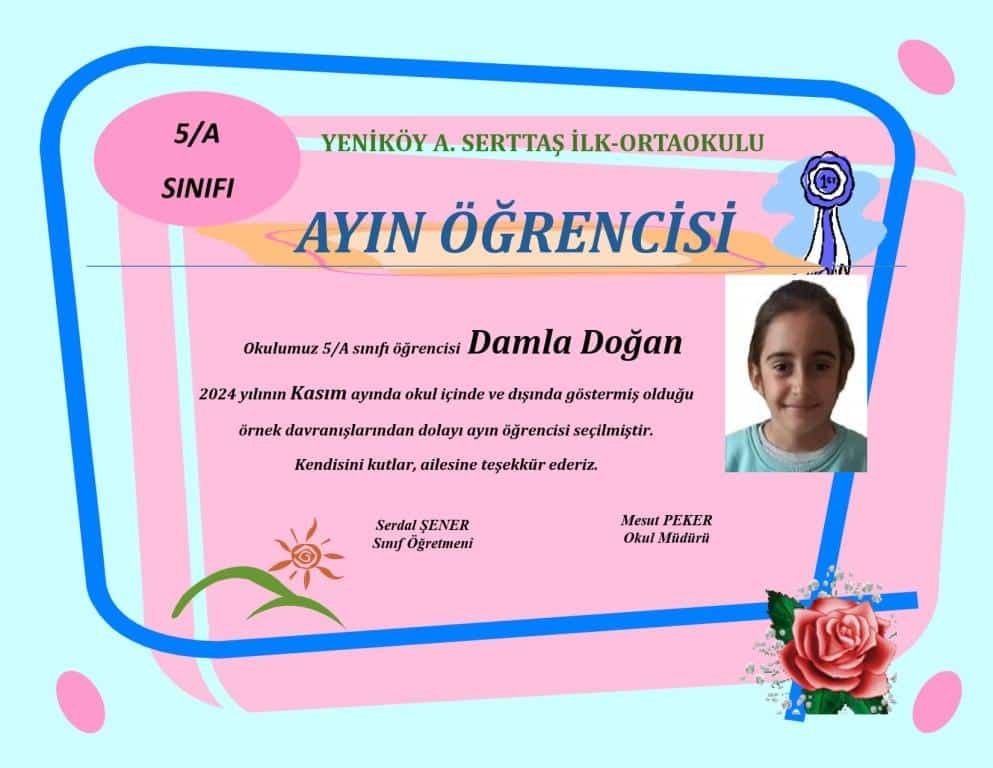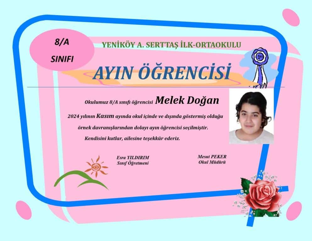 Okulumuzda kasım ayı içerisinde örnek davranışlarıyla ön plana çıkan öğrencilerimize belge ve hediyelerini takdim ettik. Kasım ayı örnek öğrencisi seçilen öğrencilerimizi ve değerli velilerini tebrik ediyoruz.